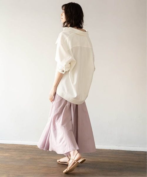 麻混のシャリ感×合繊の光沢感の涼し気でキレイな素材を選び、カジュアル過ぎない大人な印象に仕上げました。襟を抜いた着方や、腕をまくって着ていただくとデコルテや手首が見えてぐっと女っぽい雰囲気に。